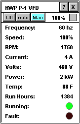 3) User Override Control (Analog or Variable Output Devices):![]() a. Off/Auto/Man Override "Pop Up Windows". i. Point your cursor over the device you wish to override, the cursor will change from a point to a hand. This indicates the object has a pop up window, or additional control information. Click the device with your mouse. ii. This new window can be very simple or extremely detailed depending upon the software control sequence associated with it. iii. The diagram below shows a heating valve override window. The blue highlight indicates that the valve is currently in automatic control (being commanded by the control software). iv. Clicking the Off button will force (and hold) the device off, or to its minimum position (may be greater than 0) until another button is clicked. The Off button will now turn blue, and the Auto button will turn gray. v. Clicking the Man (manual) button will display a text entry box. Enter the desired commanded value (use caution to ensure the value you enter is within the limits of your system), and press the enter key to execute the command. The Man button will now turn blue indicating the device is in a manual state. The controlled output value will remain in the text entry box and be displayed on the main page near the device if appropriate. vi. To return to automatic control from either an off or manual condition, click the Auto button. The software control sequence will resume control of the device. The Auto button will turn blue. vii. Close the window by clicking the X in the upper right corner. 1. Note: A value of zero (0) will return the device to Automatic control. 2. Note: Be sure you are familiar with the sequence of operation, and how each device interacts within the system. 3. Note: You may be prompted to enter your User ID and Password to access the new window (this counts as a connected user). Next Section - Alarms & Trending |